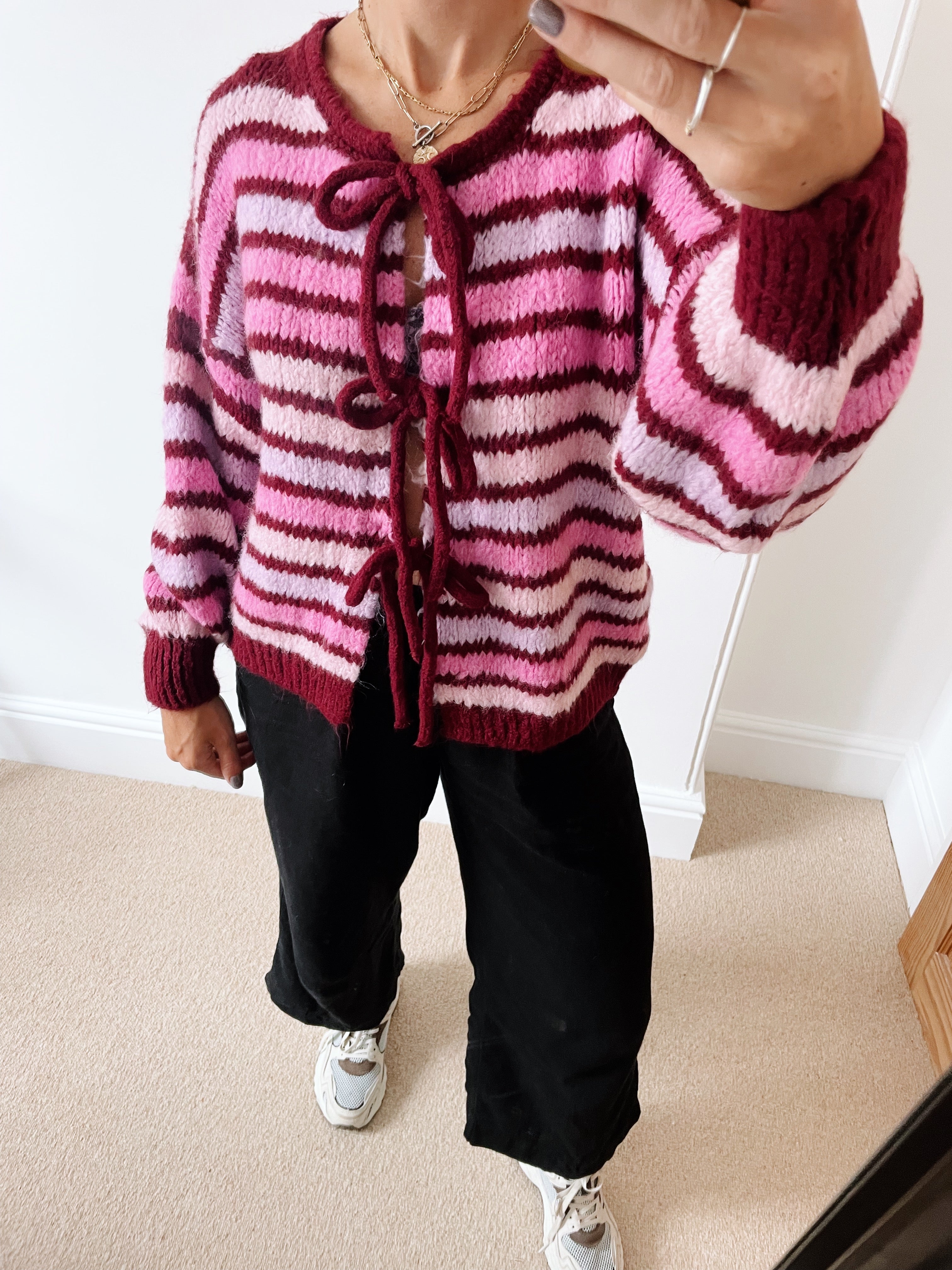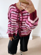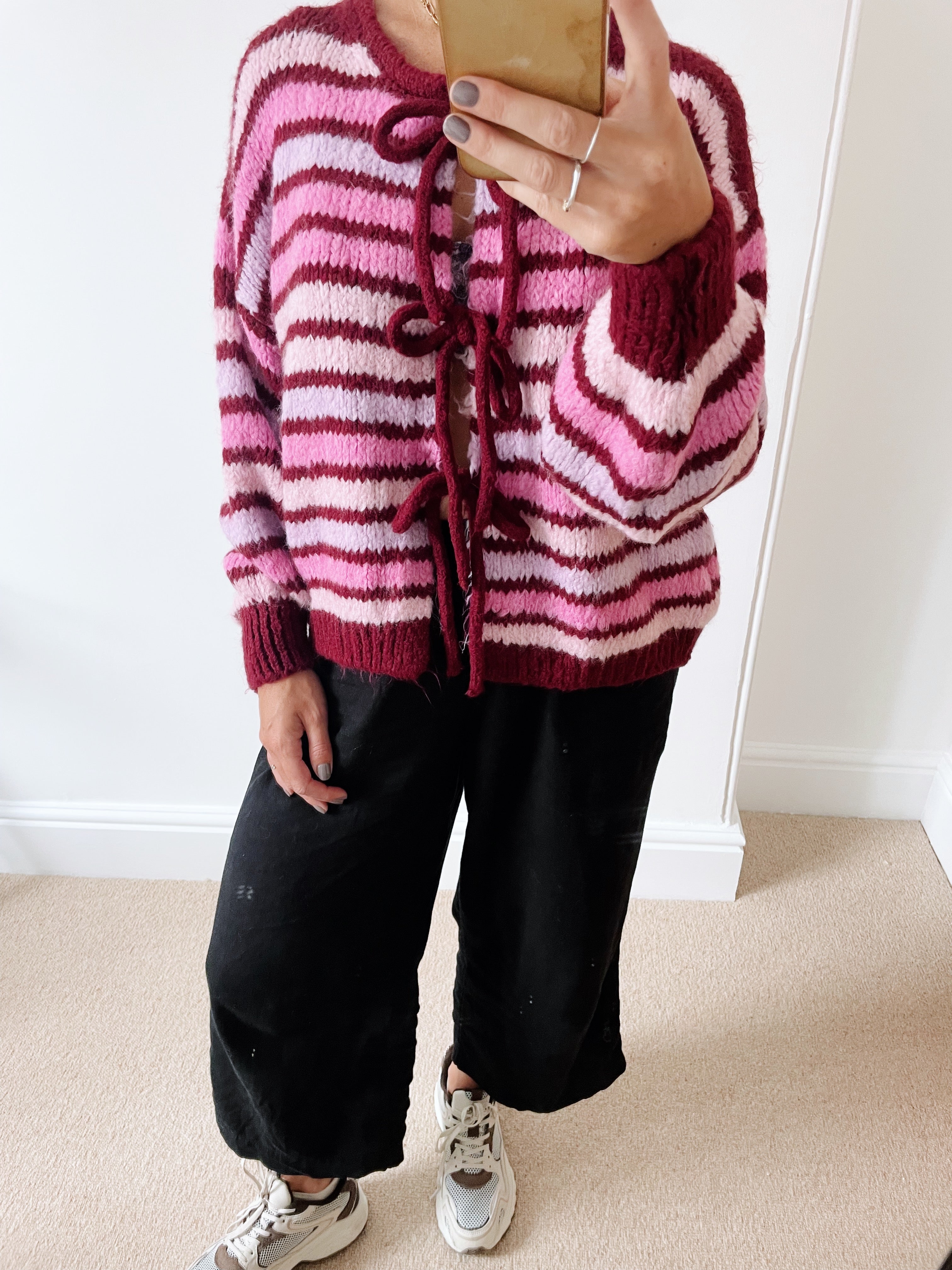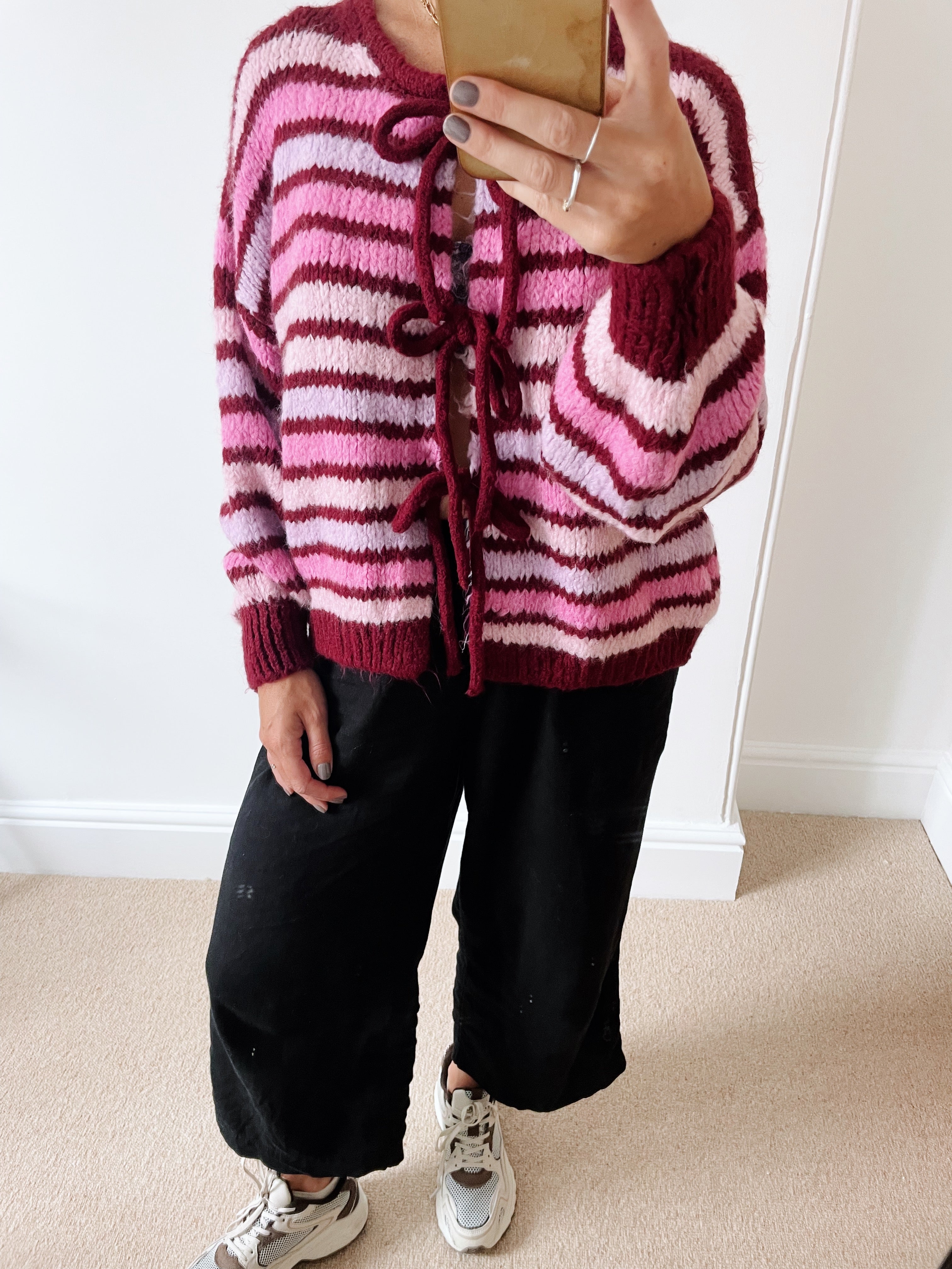 Striped Knitted Cardigan with Tie Front – Burgundy & Pink