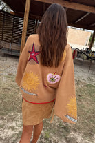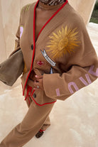 From Never Fully Dressed comes this lightweight cardigan designed for cooler evenings, featuring thicker ribbed hems that give a subtle nod to a bomber-style silhouette. The soft, knitted fabric has a luxurious weight that drapes beautifully over the body. Embroidered with intricate motifs inspired by the gold and silver accents, engraved suns, and moons found throughout the souks of Marrakech, this piece brings a touch of artisanal charm to everyday wear. This is perfect mix between a coat and a cardigan