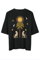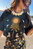 Add effortless style to your everyday wardrobe with our bohemian graphic print T-shirt. Designed in 100% soft cotton for comfort, this versatile black tee features our signature leopard motifs, tropical palms, and sunshine artwork – a nod to Never Fully Dressed’s iconic statement prints.