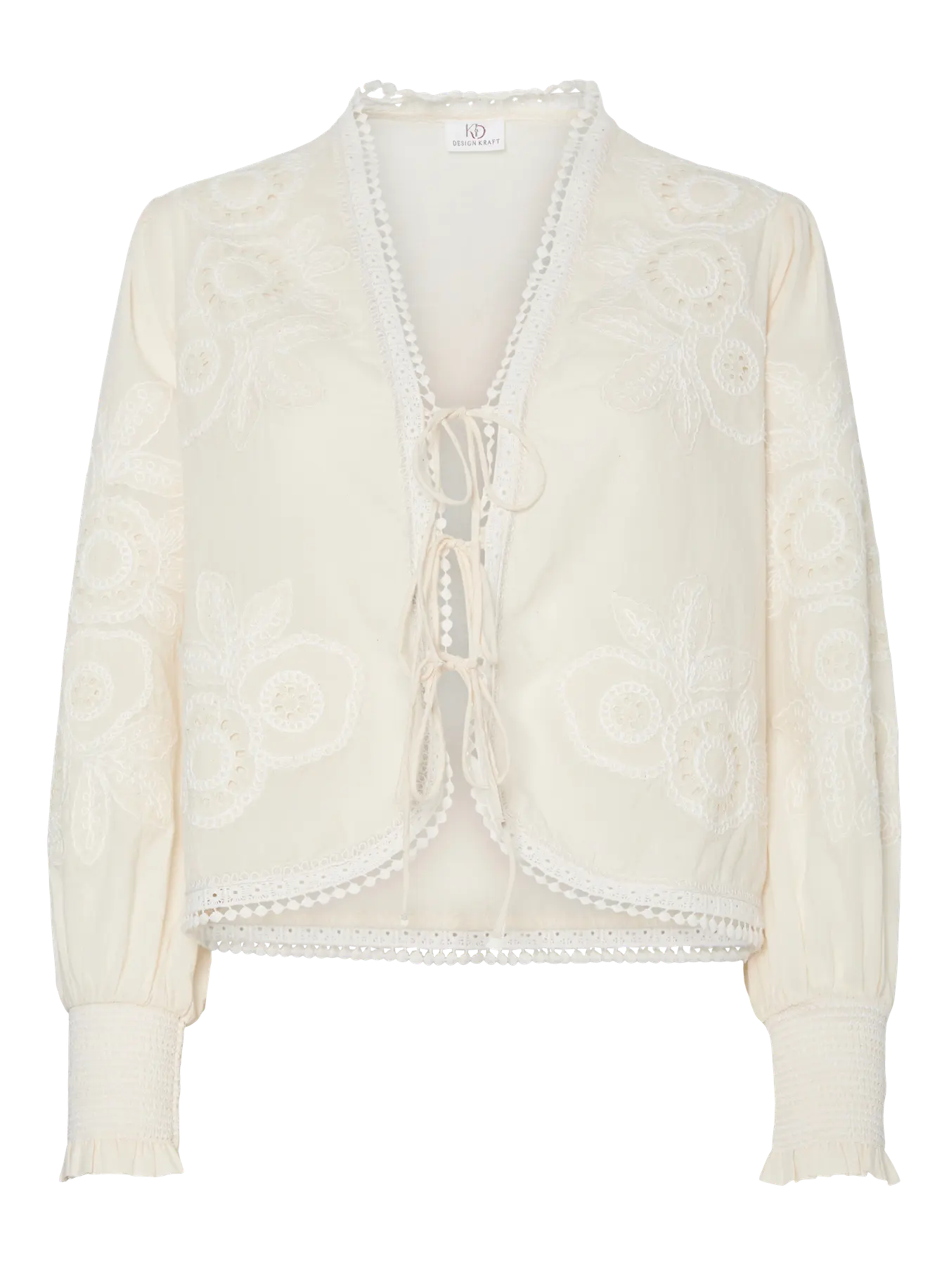 A beautifully bohemian piece for the transitional season. Crafted from 100% cotton, this lightweight top features three delicate front ties, intricate embroidery throughout, and crochet edging for a feminine finish. The long sleeves are detailed with shirred cuffs for subtle volume, making it an easy piece to dress up or down. Perfect with denim for daytime or layered over floaty skirts for a relaxed, free-spirited look.