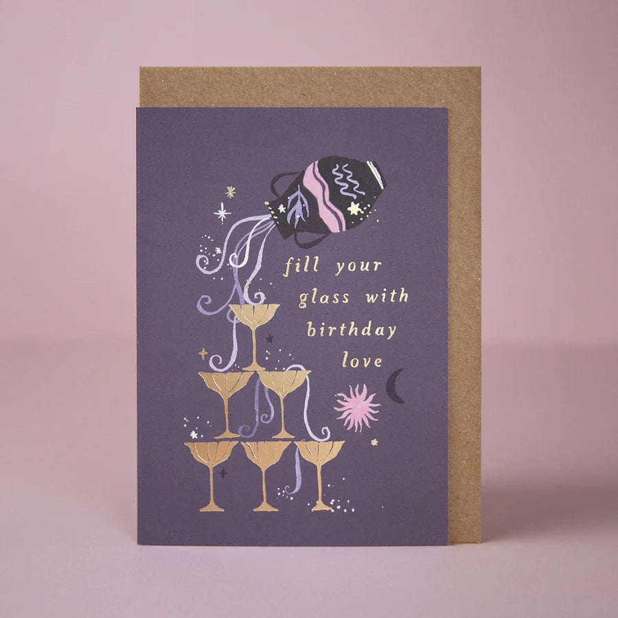 Pop the bubbly and fill your glass with birthday love with this illustrated champagne zodiac birthday card, inspired by the Aquarius star sign.