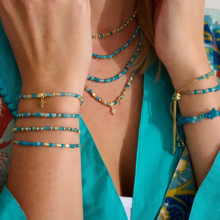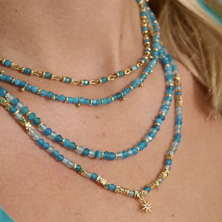 Each Apatite bead in this gemstone necklace shifts between shades of deep ocean blue and soft seafoam, creating a beautiful, natural flow of colour. Apatite is known as the Stone of Manifestation, believed to bring clarity, confidence, and creativity, perfect for free spirits looking to channel positive energy. 12k gold accents add warmth and shimmer, creating the perfect contrast of earthy vibrance and celestial glow.